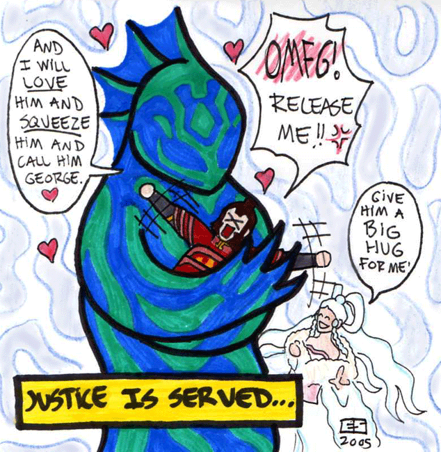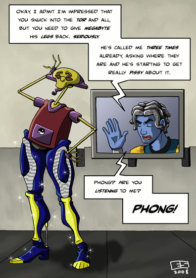 Hex isn't the only one who likes a good tea-party...tho Megabyte probably prefers to drink coffee during his instead.Poor Phong, having to suffer Megabyte's whimsies. Worse than his cruelty, I'm sure.
