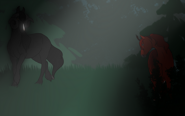 Hunter was tired. He had been walking ALL day, even running a few times, marking his territory. This part of the forest is now his, and nothing had stopped him. He now slowed to a gentle walk, and sighed. 'I should probably rest soon,' he thought to himself. As he sniffed the air he watched the stars twinkle. It was early in the night. The sun had just finished setting. A warm breeze tickled his nose, bringing the scent of dogs on it. Wait, dogs? He suddenly heard barking in the distance. Red filled his vision as rage built inside him. 'I'm NOT losing all this hard work to some mangy mutts! I'll teach them!' He reared, let out a warning bellow and charged towards the barks and yips, steeling himself for a fight.---