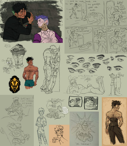 There's a couple @'s under some of these because I found a bunch of very useful poses from other srtists that I wanted to reference. I do this to get a grip of how foreshortening and volume works, but also to help me figure out more dynamic poses for future knowledge, and also how the more "meaty" parts of a body works when in these kind of poses. Things like thighs, calves, arms, any clothing, etc. all have physics and are also affected by gravity and pressure points, and it's hard to draw, man! So yeah, references are needed for me while I'm still in the process of figuring out how that shit works so that I can eventually be able to draw it all on my own like a big boy. (So yeah, thank you star_bite and kitkaloid, love you and your art mwah <3)
