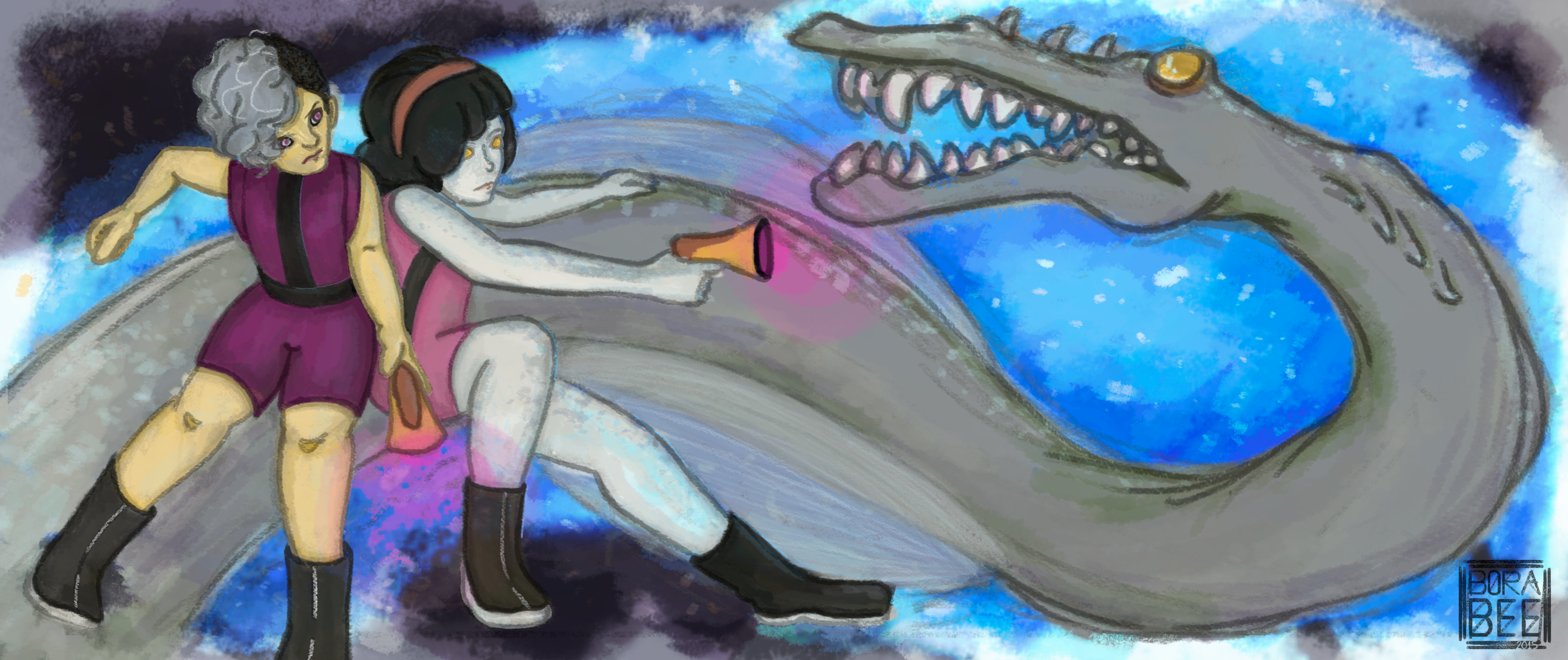 Another picture for one of my drawing dare groups on Facebook. This time the theme was space opera o/ And what a better way to celebrate how terrible this year was for sexist sci fi movie fans, than to have two bad-ass girls fight a gruesome space-eel-dragon-monster? XDI wanted to try out this more horizontal format because I've been planning on making myself a pretty social media header for ages now but I kept insisting on the "character floating on a crazy background" thing instead of JUST DOING IT. I guess this is still kind of characters floating, but at least they're interacting now and it makes a bit more sense for them to be floating since they're in space after all haha. So now that I followed Shia's advice, I have a proud new cover for my facebook page (fb.com/borabeeart) yaaaay! I also tried a new, more painterly style for this piece. I just wanted to try some new tablet based possibilities, like more expressiveness on the shanding and the markings, which in paintings like the horns on the Nevy fanart (fav.me/d93ph52 ) took me ages to accomplish with only a mouse.