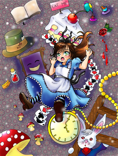 Alice's dress looks a little odd - like the fabric is super drapey and slinky, not something a child's dress would usually be made of. The only other thing I could think of to do differently is to work on the perspective a little bit (the tiles at the bottom could be larger, to give the illusion of being closer to the viewer), but since it's wonderland, that doesn't even seem like a big deal to me.