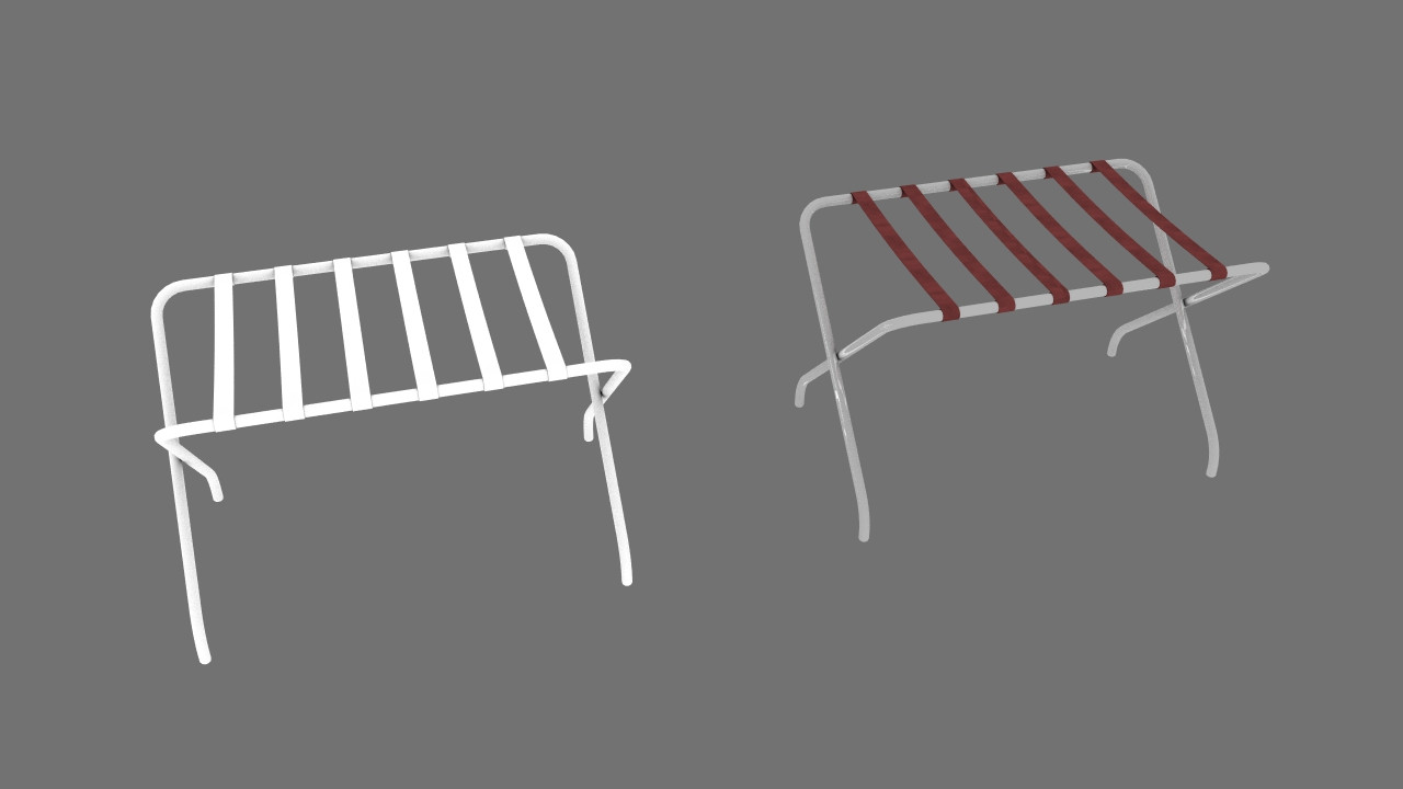 Do you have a motel room, but feel like something is missing? It's this thing, the cheap little rack for your luggage. Two material zones so you can customize yours!