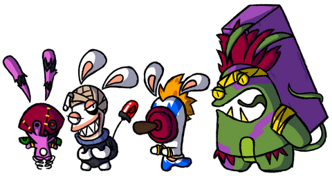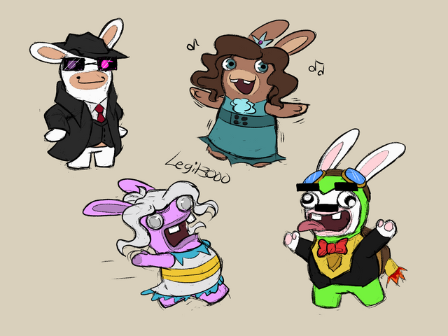 But... In lights of Rayman and Rabbids fans digging in the RRR prototype that's was leaked days ago with the source code and popping in my timeline around YouTube, here's some Tamagotchi + Rabbids doodles of the Rabbids cosplaying as the Tamagotchi characters but in the style of the RRR prototype Rabbid type.