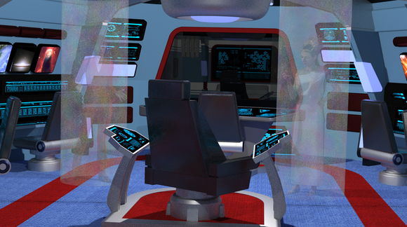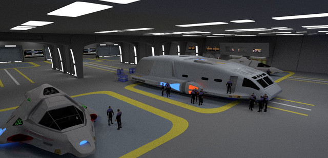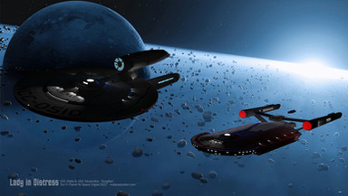 Ambassador Sarek and his wife Amanda arrive at the USS Yorktown, having just arrived via courier shuttle. They are there to escort their son to his newest station: the USS Enterprize, seen in the distance. Sarek helps his wife out, for while a courier shuttle might be one of the few small faster than light ships, they are not known for their comfort. Their pilot, in the meanwhile, awaits further instructions from the bay master.From the creative minds of Gene Roddenberry and Syd Mead comes STAR TREK: DRAMA IN THE STARS!