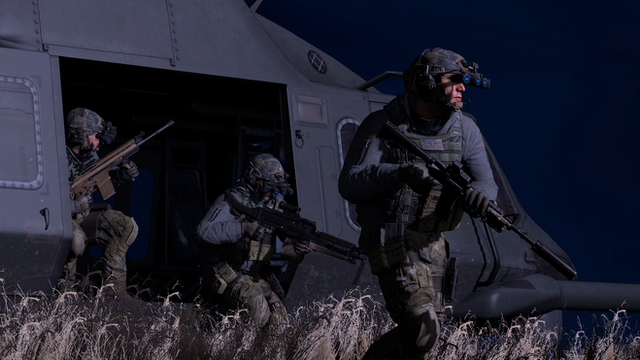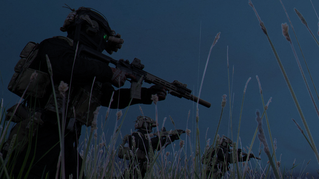 A special forces team move through a wheat field in the night to hide from enemy drones in the sky.