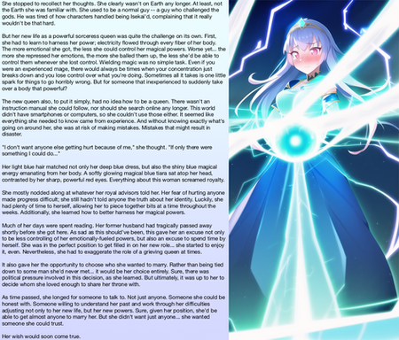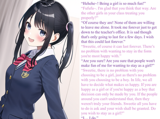 "I mean," Miss Marisa said, "that I can make the magic permanent. If you choose to stay as girls, the magic will keep controlling you to become feminine, elegant, and graceful. And it will also prevent you from telling anyone about this lesson, But if you choose to stay as girls, you can't go back."
