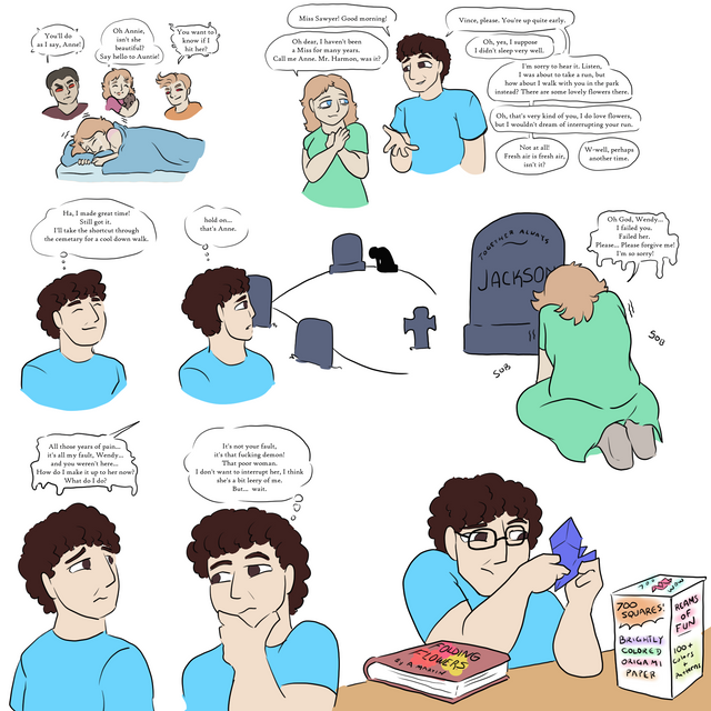 You ever get so involved in something you forget you're a human with needs? And then the dead guy has to remind you?Steve (dead guy) and Dallas (fixated artist) are mine.