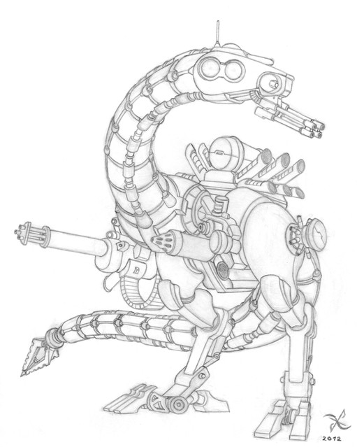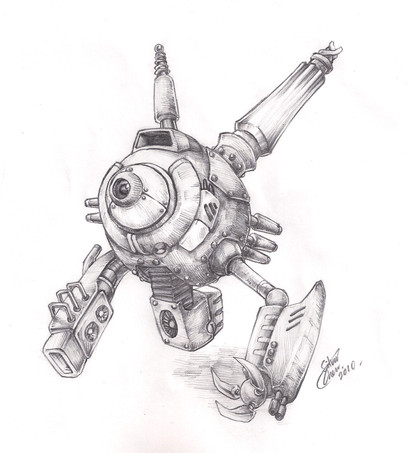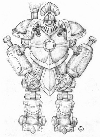 I received an odd commission request at Otafest: a drawing of a steampunk character. Not odd in an of itself, mind you. But that was the extent of my information to go on. Which essentially made this a design project rather than a standard commission. I figured if I was gonna make a new character, I may as well draw a robot. Hence this guy was born.I call him Arlington (Arlo for short). His core generates enough power for him to think and speak (via voicebox under his grill); the harder he thinks, the more exhaust his hat releases. His single arm ends in a cane. His core rests on a swivel base, which in turn rests on three greased spheres (he is obviously only designed for use inside and on flat, clear surfaces). Probably a librarian or archivist of some sort.