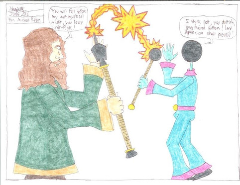 Now he look for Darc in a tournament, where he can punish evil and find a girlfriend. He has a sword that can cut through anything (because it one dimensional) and he cannot be hurt by any attack because his has only one dimension. He also use magick like fire to kill people. he can also teleport to avoid any attack.