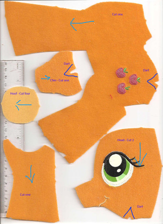 First thing, cut out the pattern. Then, pin on your pattern to the fabric so the fabric doesn't get messed up. Cut it out. On the head, cut the little slits. Have all the pieces in one pile and throw out the scraps. Get one body piece, one back leg piece, and one front leg piece, and two hooves. Pin on the back leg. Get the thread and measure how much you need. Add a few inches more than double it. Put the needle through the thread and tie the two end pieces together. Cut off the extra bit. Start sewing from the back most part. Continue all the way down. Pin the hoof piece on than sew that on. Make sure you take the pins off afterwards. Do this again for the other half. But make sure itβs on the opposite side. (See row two pic one). Get the belly piece. Put it by the correct area. Using the same thread and needle technique, sew that on the legs. Make sure you don't sew the leg and body together. Sew the other side on. Note, this is the trickiest part to me. After you sew the belly, sew the chest. DO NOT SEW THE HOLE ON TOP!!! Then, sew the butt together. Note: the hole you have to leave to attach the tail. Turn the body inside out. Take a cotton ball and fluff it out. Put one cotton ball in each hoof. Take the stuffing and fill in your plushie. Don't put in too much or it will not look nice. Sew the back up, make sure to leave the tail hole, and up the neck. Make sure you don't sew the neck hole. YAY! You finished the body.