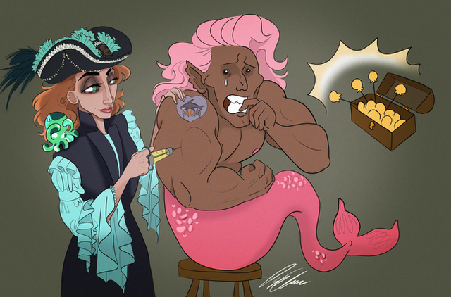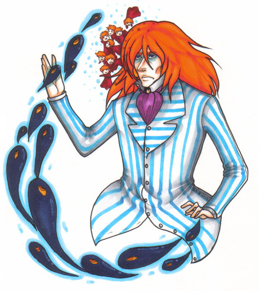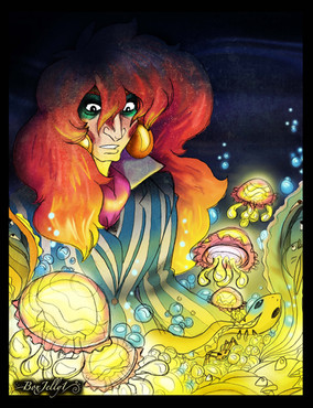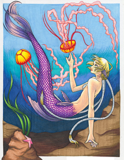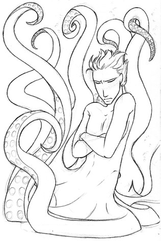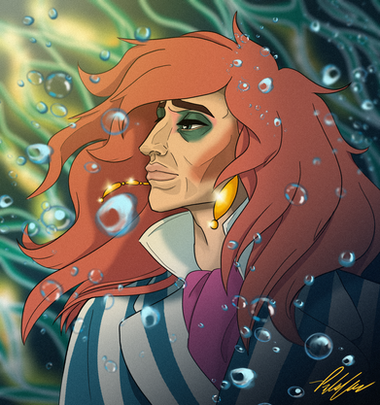 ...Glorious. He looks gorgeous, and so peaceful, for once. :'D Soothed & embraced by his faithful, colorful sea creature friends. TCH'AWWWWWW. That's a wonderful drawing. I guess I think of his own colorful markings as ones that kind of naturally (or magically?) appeared over time as a result of living underwater and forming such a strong bond with the fishes and other marine life. Someone else mentioned that they're also similar to marks that form on divers due to water pressure, which seemed sensible to me, so I incorporated that into my general idea as well. ^^