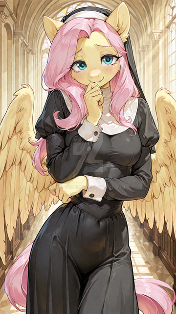 #mlp #pony #blushing #church #fluttershy #greeneyes #indoors #necklace #pinkhair #sitting #stockings #yellowfur #looking_at_viewer #nun_outfit