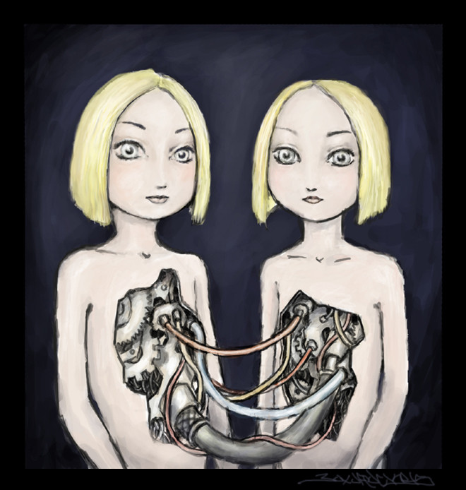Wow this is really cool. I like how it could just be twins with the same working minds, or it could be conjoined twins.