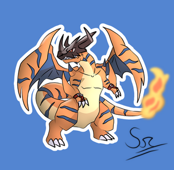 Como sabran me gusta mucho Greymon y Charizard a si que un día pensé en como seria una fusión entre estos dos y bueno he aquí mi resultado yo lo llamaría Chareimon , ¿pero y tu? , ¿ como lo llamarías o como crees que luciría? saludos!!As you know, my favorite Pokemon is Charizard and my favorite Digimon is Greymon, so one day i thought , How they would look this guys if they can do the fusion one with the other ? , well, that is my result , his name maybe is Chareimon, and you? , How would you call it? or How would like to see this creature?