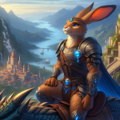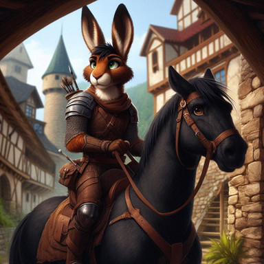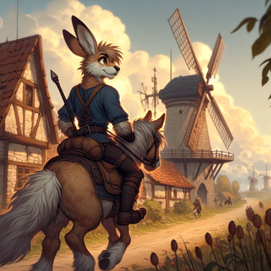 Prompts:Β furry anthro character, youthful lanky tawny hare guard, riding a rabbit down a road past a windmill, digital art, fantasy, medieval