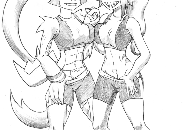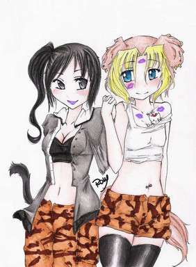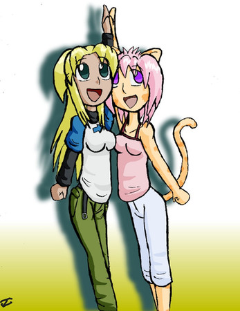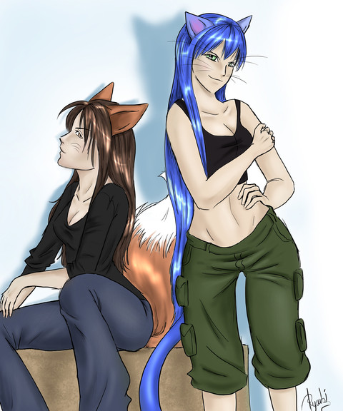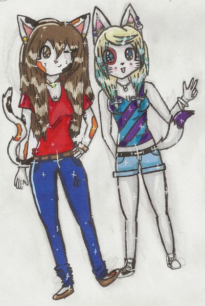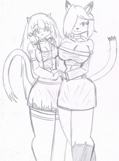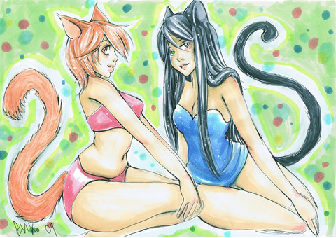 Two cute cat girls standing around. A very serious work for me.It's still WIP as I haven't yet colored their skin. Not sure what I should do with that, though...