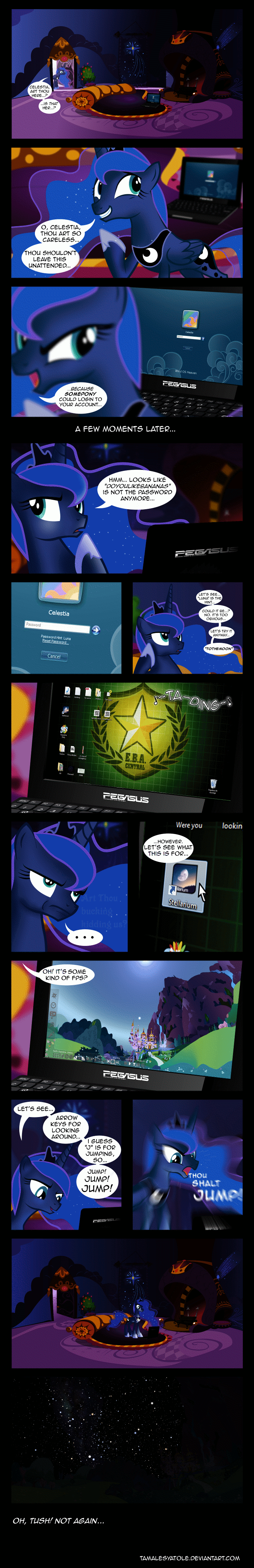 I finished the first four panels a week ago to wait and see when the banner would change on EqD and it was a SKYRIM BANNER! LUNA AND RAINBOWDASH APPROVE!