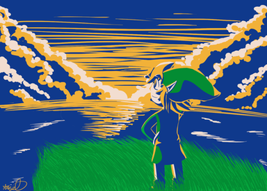 awesome! I love the sunset in the sky and how it reflects across the water. cool silhouette of Link too