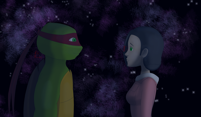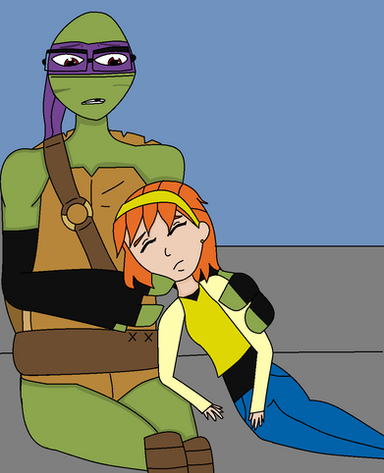 This is a VERY LONG DUE art trade with ~donatelloxapril4ever that I've owed.In my defense, I cannot draw humans and yes, April's head was reffed.