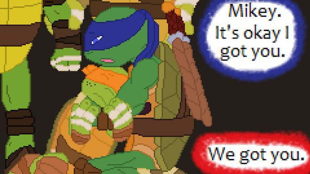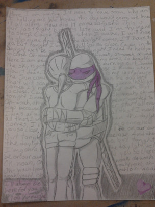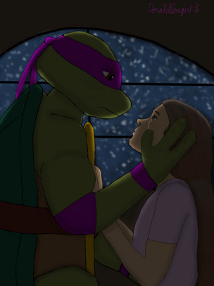 My friend Austin, (well, more-than-a-friend if you know what I'm saying) moved to a town 6 hours away, and he showed me the song just before he left. It made me cry, cause it fit us perfectly, and I drew a picture of Donnie and April hugging for him with the lyrics in the background just after he left and mailed it to him. His favorite turtle is Donnie and we often compare ourselves to the two of them. I wanted a story to go with it, and since you need inspiration... Would that be to much?