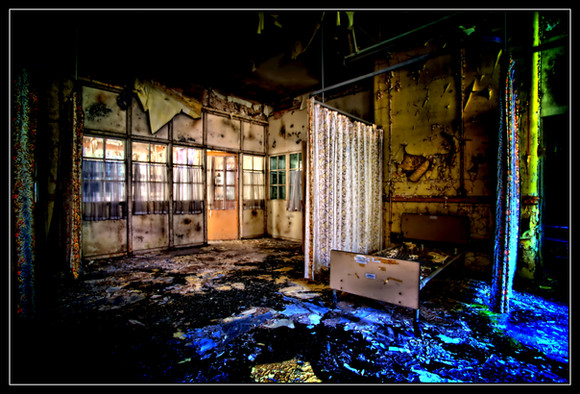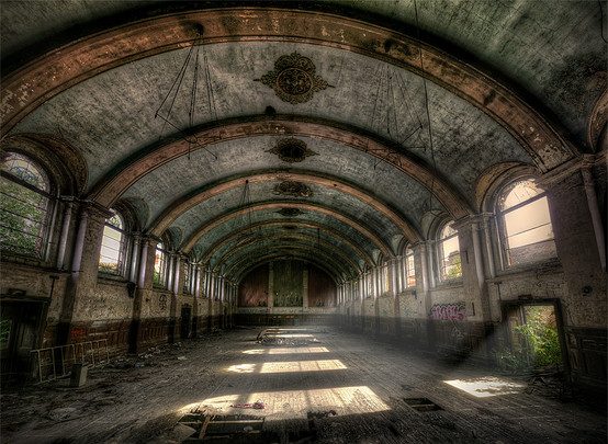 Wow. Don't think I've seen many interior shots like this. You get a strange sense of vertigo, like you can't quite tell where ceiling and floor are - almost like one of those trick carnival funhouses, all the more ironic seeing as it's an army barracks. Good shot.