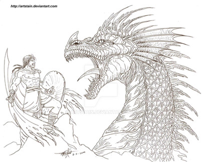 Marvellous work, BrassDragon! I really enjoy it when people draw D&D (especially Chromatic) dragons, and even more so when they're done well. The Red Dragon is so beautifully done, her proportion and anatomy is so nice, as well as the details of her scales/muscles/jaws/everything. The smoke furling out of her nostril is a nice touch, adds a bit of life to the image. I really like the man as well, he looks rather simple and certainly brave to face a creature like that without shrinking away. Very nice chest also, rawr. :3