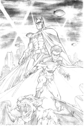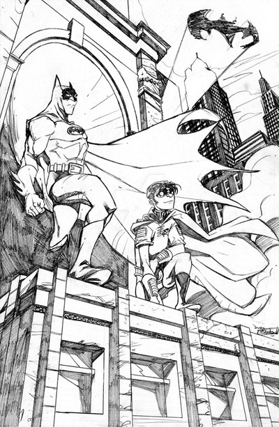 Now, it took me a long while to warm up to Robin. I just didn't see what a grown man would be doing, raising a kid in that kind of environment. But, I read Dark Victory a while ago, and it just clicked for me. Robin's okay in my book.I like the whole "father-son" dynamic and wanted to play up on that a bit. Most fathers and sons go fishing, and Batman and Robin are no different. Just the fish they're trying to catch are usually armed.
