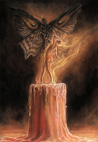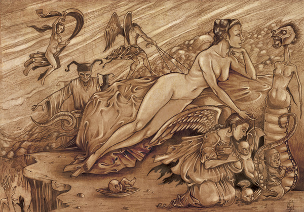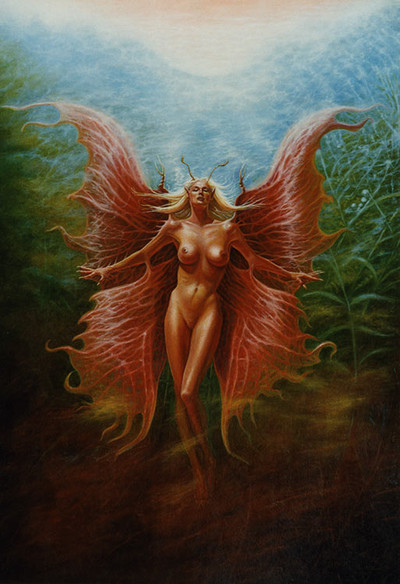 Floating around,huh? Nicely put. OK, this is fabulous for so many reasons. First, it's very different from your usual. I'm not just talking about the novelty, I mean you have diverged from your typical style and done a brilliant job on it. I really like the way your fantasy images become mist as you move to the edges. I have seen butterfly wings coming out of the back, making a fairy w/six limbs. I'm pretty sure I've never seen butterfly wings as the arms, maintaining the quasi-mammal as a four-limbed creature. Not only have you shown more creativity in drawing your figures that way, you've executed them beautifully. If there is justice in this world you will see fame and fortune for your talent before long. You just need to be willing to shamelessly, aggressively, pimp your work.