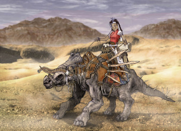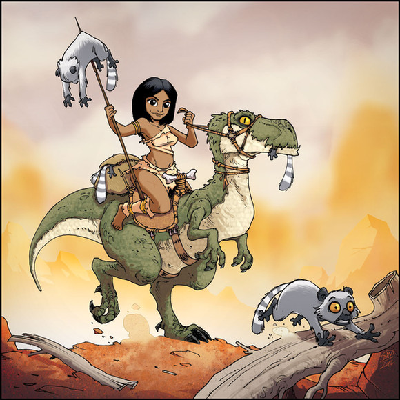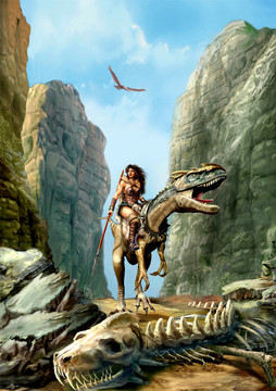 Dinosaur-riding amazon-ish spear-lady.Digital, done in Photoshop with my Cintiq. Started this last summer, and finally finished it. I've spent around 20-25 hours total on this, I think. Glad to be done with it.