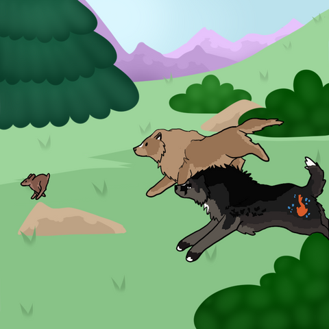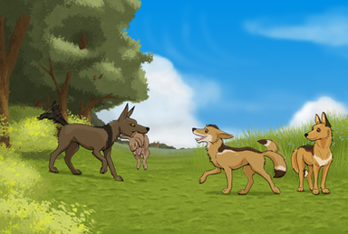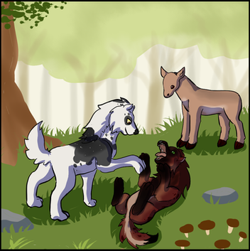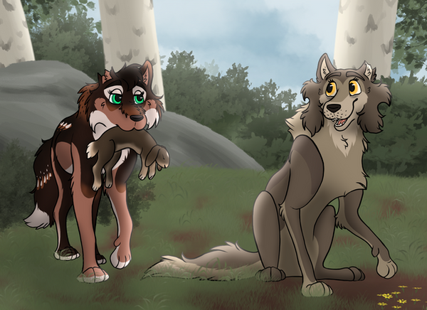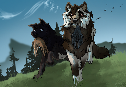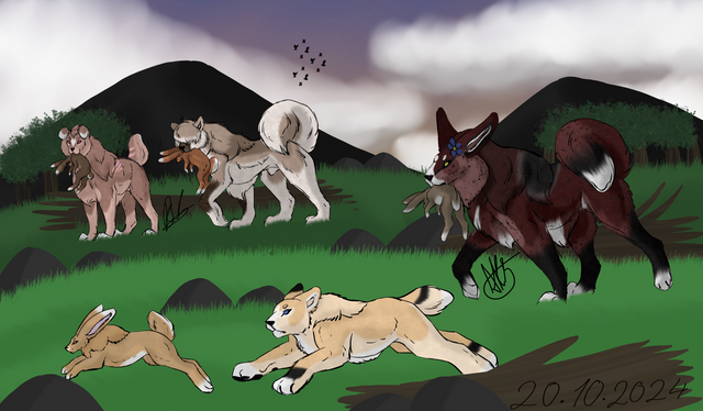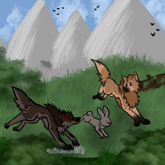 #animal #wolves #digitalart #forest #originalcharacter #arpg #brown #clouds #cream #grass #green #greeneyes #grey #mountians #rabbit #scene #sky #sun #trees