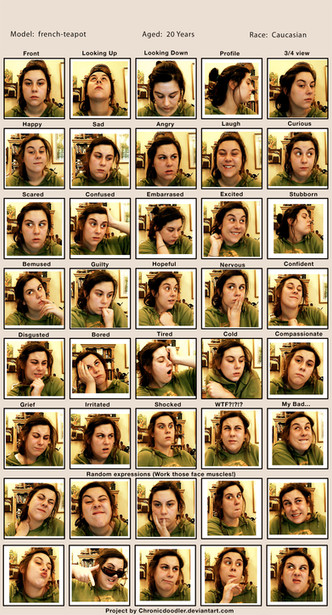 FYI, some of these expressions are taken from my sketches (oh yeah, that's right--I work backwards, baby), so they may look familiar if you look at this [link] . All I ask is that you DO NOT take my characters. Faces, yes, characters, NEIN!!!