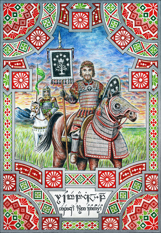 I wanted to have a shot at the "Rohirric style", so I’ve based this design on both Celtic and Anglo-Saxon styles. I’m not 100% hqppy with the final look – I guess this is another deviation I will have to “revisit” in the future.For the text I have used my own translation into Old English of an excerpt from the Lord of the Rings App. about Éomer Éadig, King of the Mark.