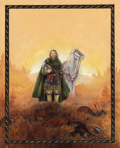 "In Éomer's day in the Mark men had peace who wished for it, and the people increased both in the dales and the plains, and their horses multiplied. In Gondor the King Elessar now ruled, and in Arnor also. In all the lands of those realms of old he was king, save in Rohan only; for he renewed to Éomer the gift of Cirion, and Éomer took again the Oath of Eorl. Often he fulfilled it. For though Sauron had passed, the hatreds and evils that he bred had not died, and the King of the West had many enemies to subdue before the White Tree could grow in peace. And wherever King Elessar went with war King Éomer went with him; and beyond the Sea of Rhûn and on the far fields of the South the thunder of the cavalry of the Mark was heard, and the White Horse upon Green flew in many winds until Éomer grew old."