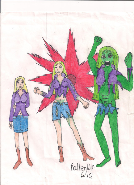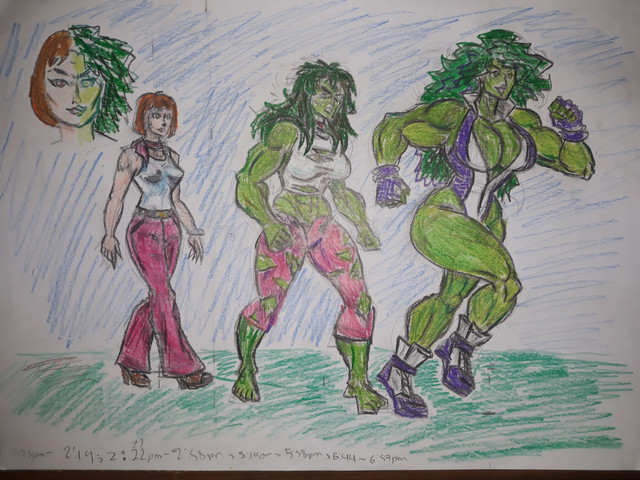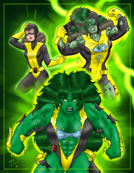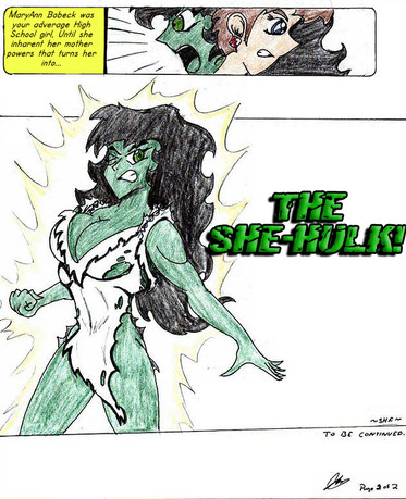 I always thought "Gamma" would be a nice alternative name for She Hulk. It's more feminine sounding and it would better fit the way she's generally drawn. Naturally I went in the opposite direction; she's far more brutal. This was before I used photoshop, so it's crudely hand colored. But I like the "live" feel of it and I managed to do a TF sequence with limited space.BTX