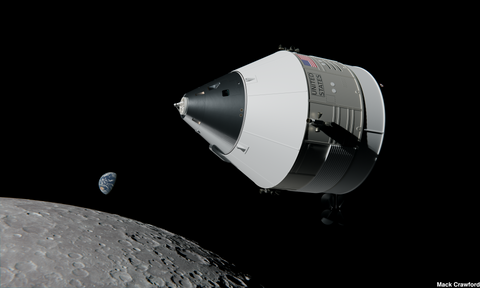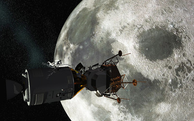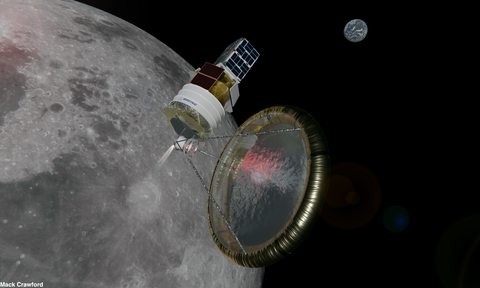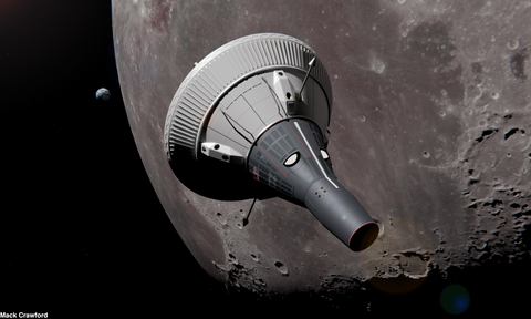A Turtle Orbital Transfer Vehicle in lunar orbit, validating systems ahead of a crewed return to the lunar surface. The Turtle OTV was proposed by Eagle Engineering in a series of late-1980s space transportation studies