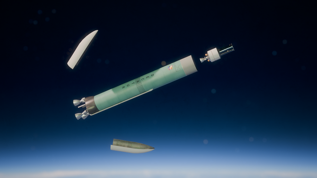 Falcon Heavy's extended fairing separates, exposing the Gateway Comanifested Vehicle. The CMV integrates Maxar's PPE and Northrop's HALO into a single station module, eliminating redundant interfaces and docking events.