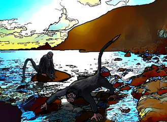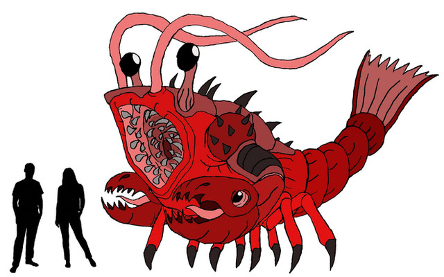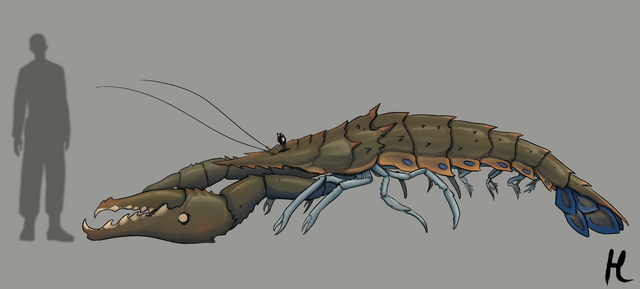The toothless snake feed on very small crustacean but they're the preys of the largest crustacean, the neorypterids.Just like its relative, the Neopalinurus finus this large crustacean named fortilinurus fortis, has very strong crab-like pincers, although it is a spiny lobster descendant. The fortilinurus don't swim as well as the neopalinurus, and hunt most of the time on the bottom of the sea.