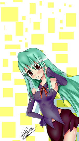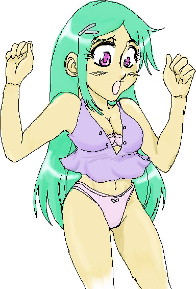 Err uhm... I mean! I like this drawing...yes...specailly her hair since it's green, and lets face it, that's the greatest color ever! Green and purple....it's a nice color combination.