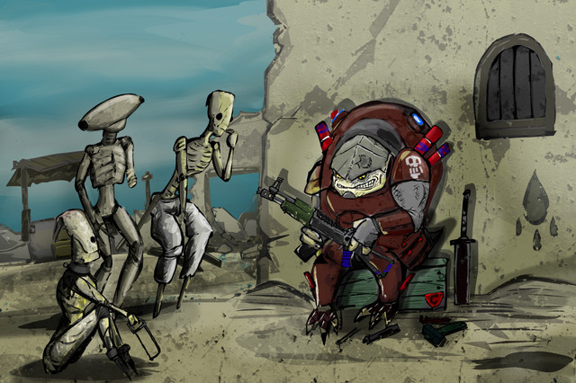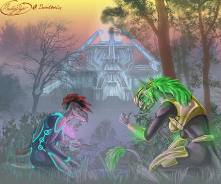 this is just a little painting i did from a sketch of hassan meeting a sweet alien from the planet his clan has disided to settle apponshe is called fayla and there will be more on her one day