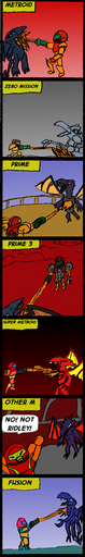 Ridley= killed by the Metroid queen (WHICH IS FREAKING STUPID BECAUSE RIDLEY CAN HEAL BY EATING FLESH, MY GO SAKAMOTO IF YOUR GONNA MAKE THE COMICS CANON THAT AT LEAST DO IT RIGHT! IN STEAD OF HUNTING DOWN THE CREATURES ON THE BOTTLE SHIP TO HEAL QUICKLY HE JUST GOES AND HIDES TO LICK HIS WOUNDS? SAKAMOTO WHY ARE YOU SO STUPID!?