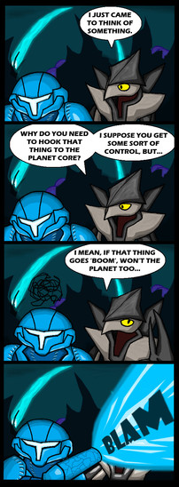 We would think. "Oh so that little runt was the reason those things attacked me and the ones before" but before we can use our imagination to figure it out. Samus gives us a long winded boring explaination to us like we're a child.