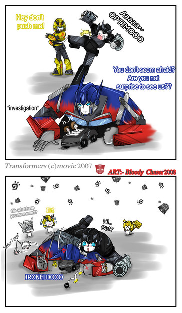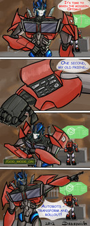 I love it XD XD he just like sitting there, y'know just relaxing waiting prob. Cleans his throat and then ratchet immediately scan to make sure he's ok and optimsu just gives out