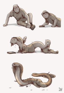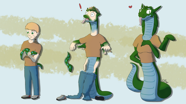 When a random rash turns out to be a spreading transformation in process. Maybe he got it from a recent hike trip or was bitten by a snake without realizing it? Whatever it was, he's got a lot of questions now.Anthropomorphic snake transformation.