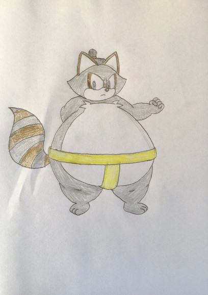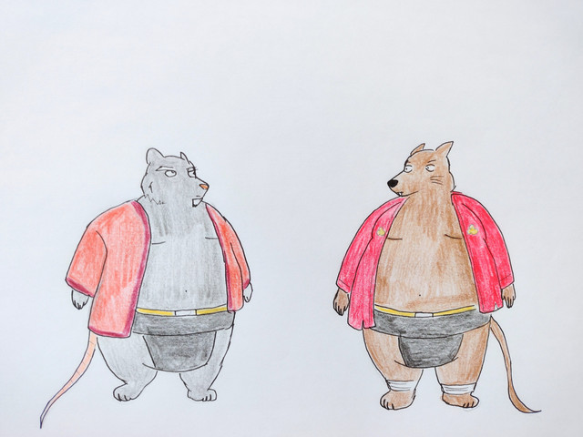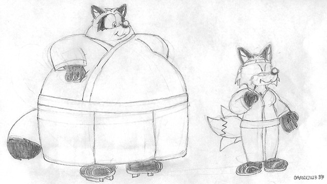 Here's a drawing to be scheduled that features two characters, but while this is pretty much another fat character-related one, it can't really be described as another "size difference" pic. It's Roocan and Roocanuki again, together this time.