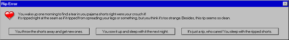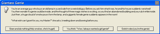 The giant stares down at you with complete disbelief. Here is a human-sized being willing to be his friend when all the others have seen him as a monster. Plus, it's a being with no where else to go, the perfect person to take as his friend. "I... I c-could really use a f-fr-friend too," the giant admits as he sniffs and wipes his eyes. "But are you sure you're willing to be friends with a three-hundred foot tall giant? Most of you human-sized beings think I'm some kind of monster."