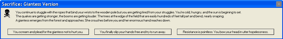 Choice 3: You wake up with spears pointed at you by human sized beings of any variation who which to sacrifice you to their giant god/goddess.)
