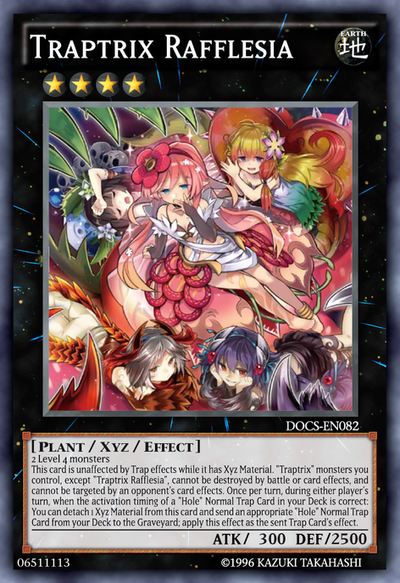 2 Level 4 monstersThis card is unaffected by Trap effects while it has Xyz Material. "Traptrix" monsters you control, except "Traptrix Rafflesia", cannot be destroyed by battle or card effects. Your opponent cannot target "Traptrix" monsters you control, except "Traptrix Rafflesia", with card effects. Once per turn, during either player's turn: You can detach 1 Xyz Material from this card and send 1 "Hole" Normal Trap Card that meets its activation conditions from your Deck to the Graveyard; this effect becomes that Trap Card's effect when that card is activated.
