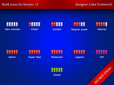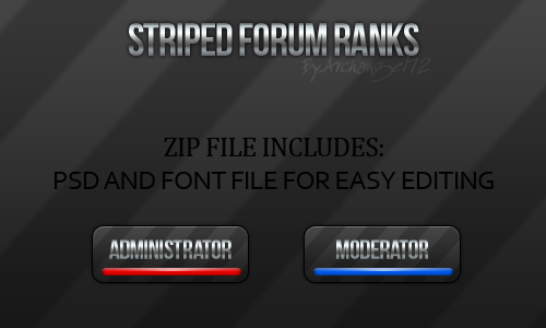 This is a nice. professional set of forum ranks great for any general forum/board. This stylish image will allow you to display your user groups with simplicity and style. There are 23 premade titles included with this file as well as the PSD and font file for easy editing. Each title is color coded to a different color but you can edit it any way you see fit, enjoy!!PREMADE TITLES INCLUDED: