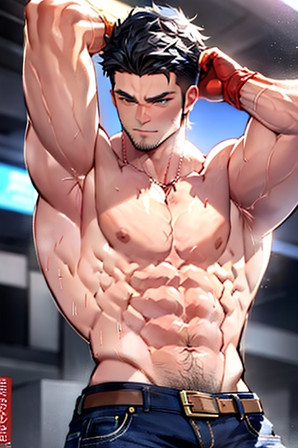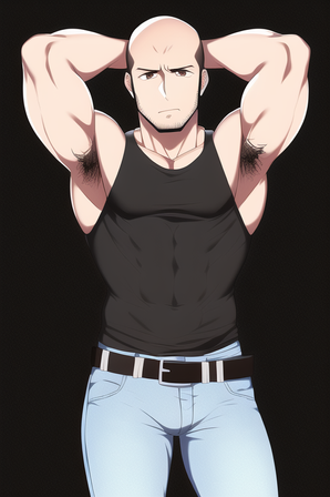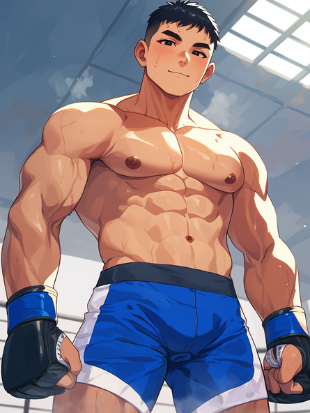#ai #anime #balding #boxing #boxinggloves #chesthair #hairychest #man #middleagedman #shirtless #shirtlessguy #stubble #sweatpants #shirtlessmale #aiart #novelai #novelaidiffusion