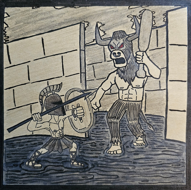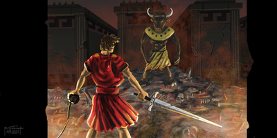 In the scene of this illustration Theseus first meets the Minotaur in his domain.